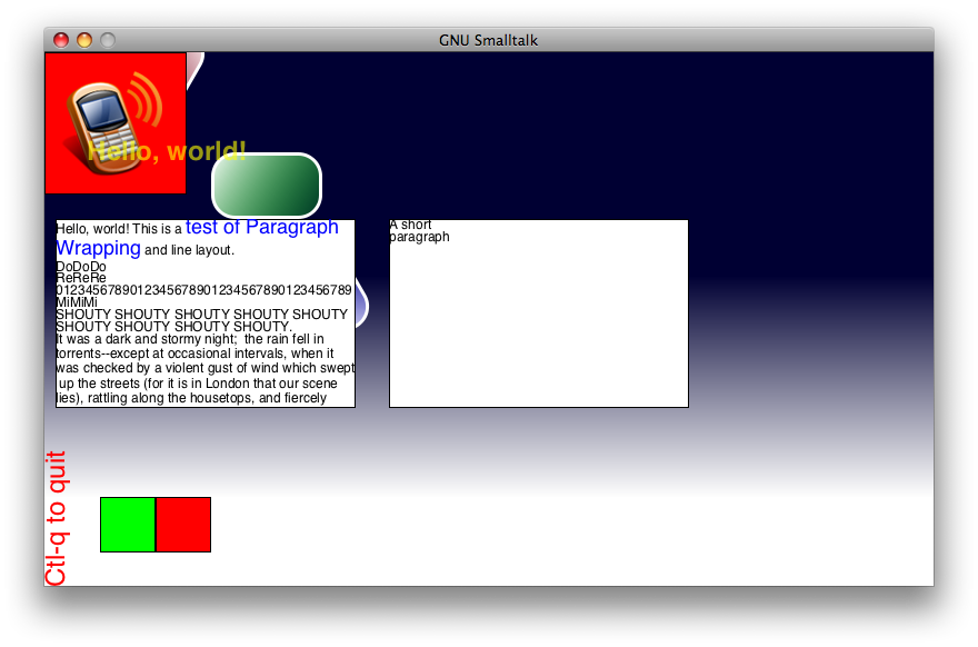 After hitting the frustrating limitations of GTK+, I started using GNU Smalltalk, Cairo, and SDL to build a simple, lightweight widget set (illustrated on the left, above) instead.