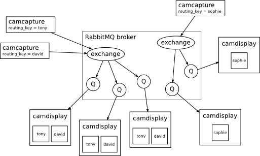 As we were working toward the 1.0 release of RabbitMQ, back in 2007, I built a program called camstream to show off some of the features of the RabbitMQ server. It’s a Java program for Linux, OS X and Windows which uses AMQP and a simple from-first-principles video compression scheme that I cooked up to route live, streaming video from one or more webcams to one or more displays.
