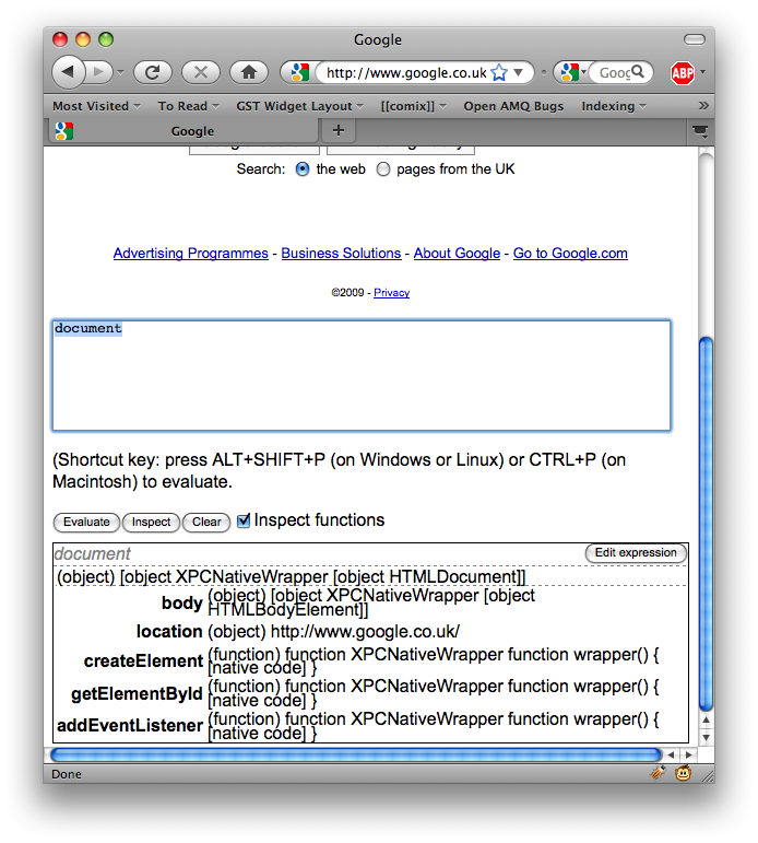 Debugging Javascript can be really tedious. Even Firebug can feel a bit heavy and awkward sometimes. Back in 2005 or so, while working on some client-side Javascript code, I built a Greasemonkey script that adds a Smalltalk-workspace-like REPL to any web page, letting you explore the Javascript objects running within it.